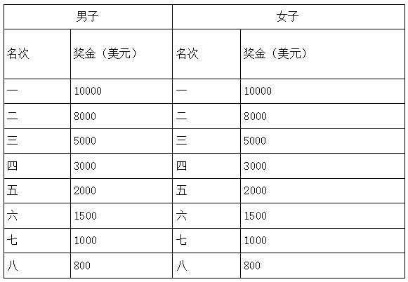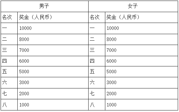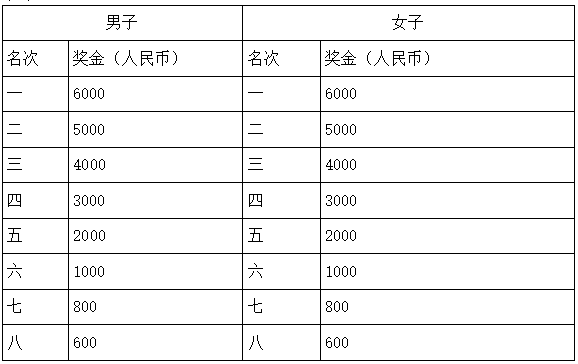 凡参加本次全程马拉松比赛的中国籍选手,录取男、女前八名给予奖励,前八名将以净计时成绩进行排名,分别获得如下表所列的奖金,奖金需缴纳20%的个所得税。