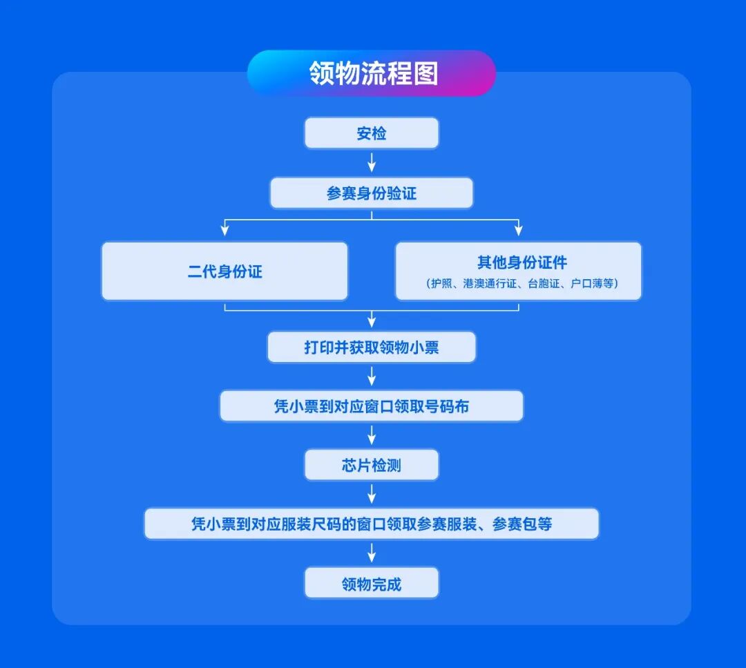 2、参赛选手本人须持报名时所用的有效证件原件(二代身份证、护照、台胞证、港澳居民来往内地通行证等)前往领取地点,通过验证后方可进入领物现场,按领物小票提示到对应窗口领取参赛物资;