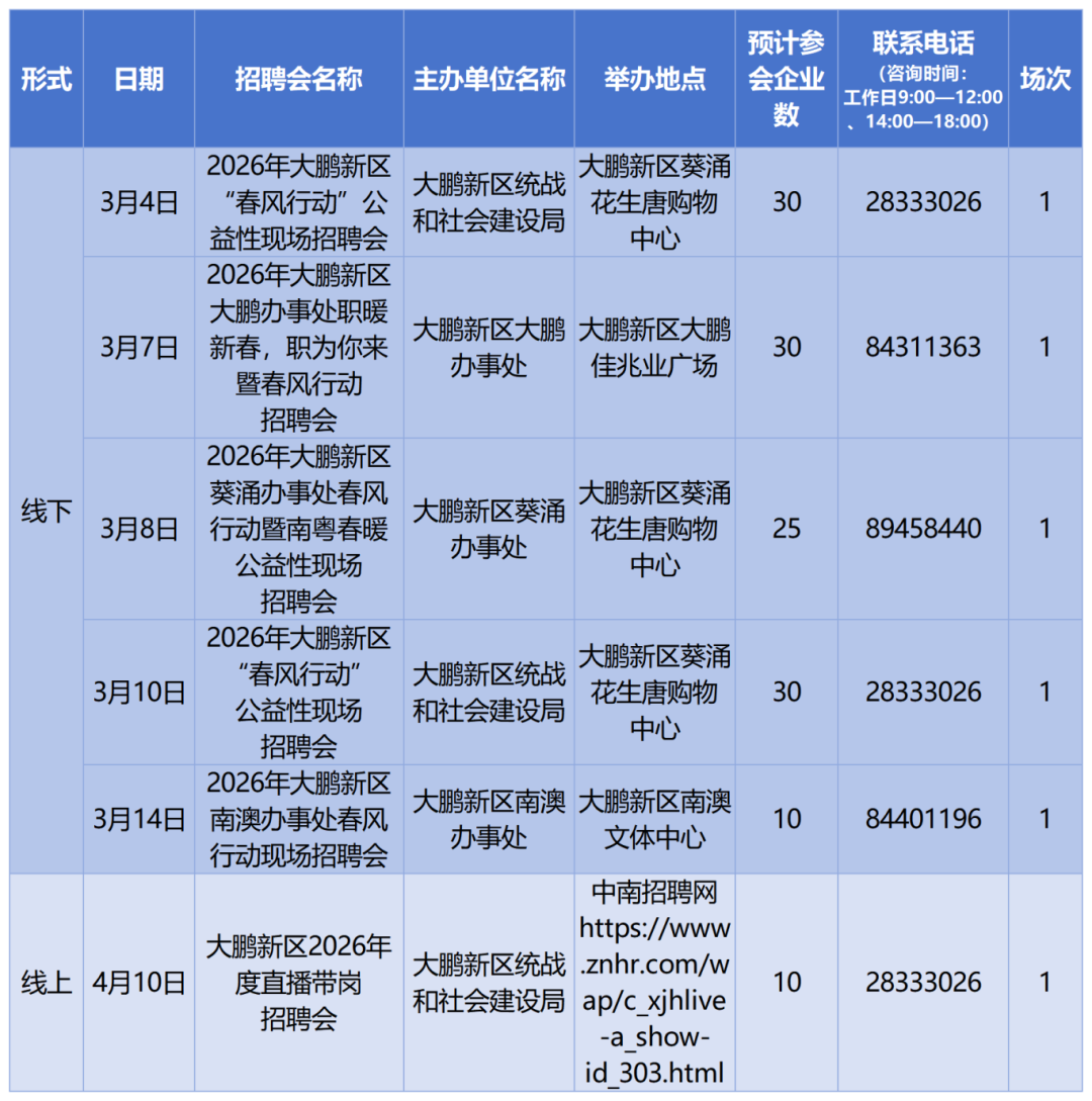 2026深圳大鹏新区春风行动暨南粤春暖专项招聘活动有哪些