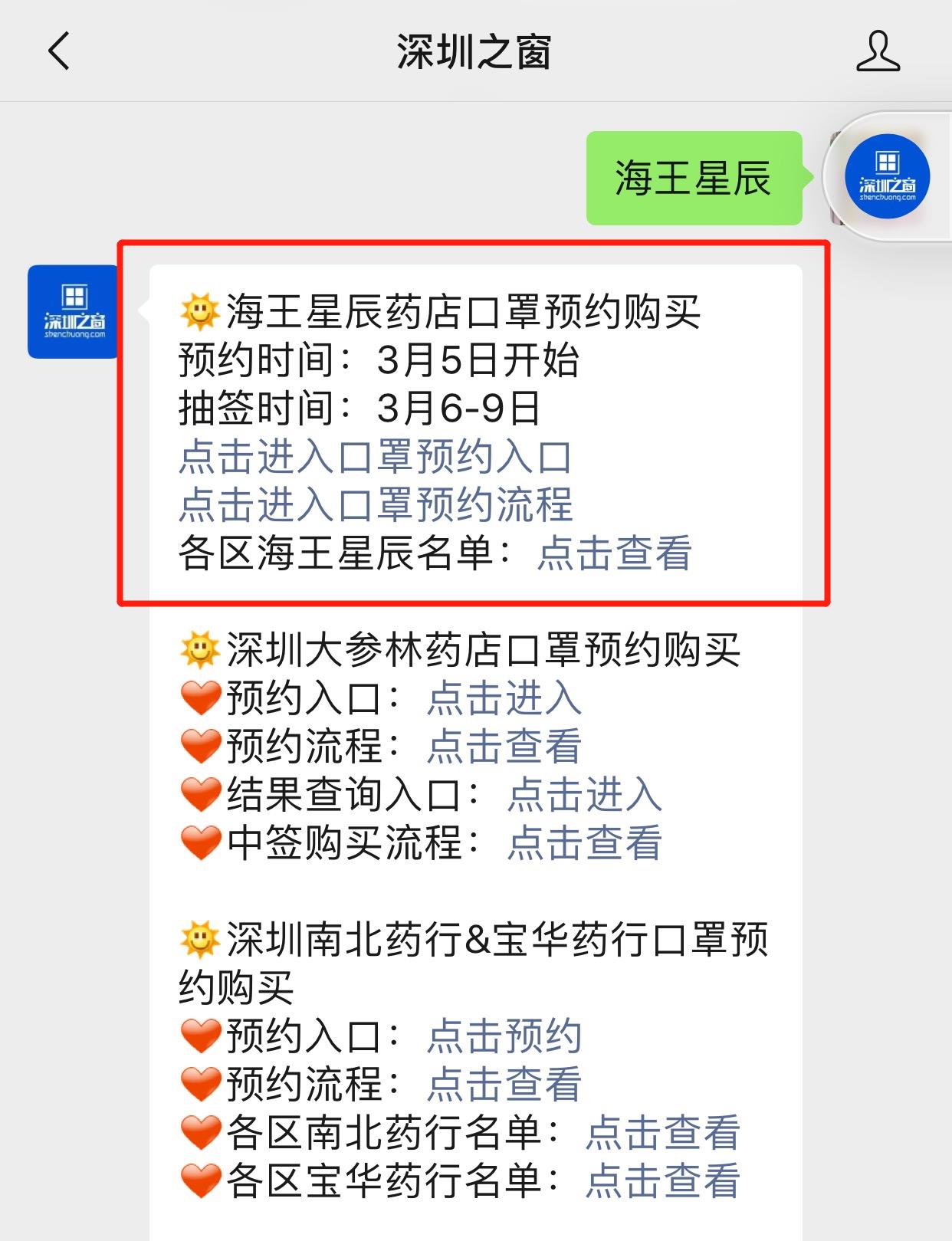 微信搜索关注【深圳之窗】公众号,对话框发送关键词【海王星辰】即可获取口罩购买预约入口及查看深圳各区海王星辰门店名单,
