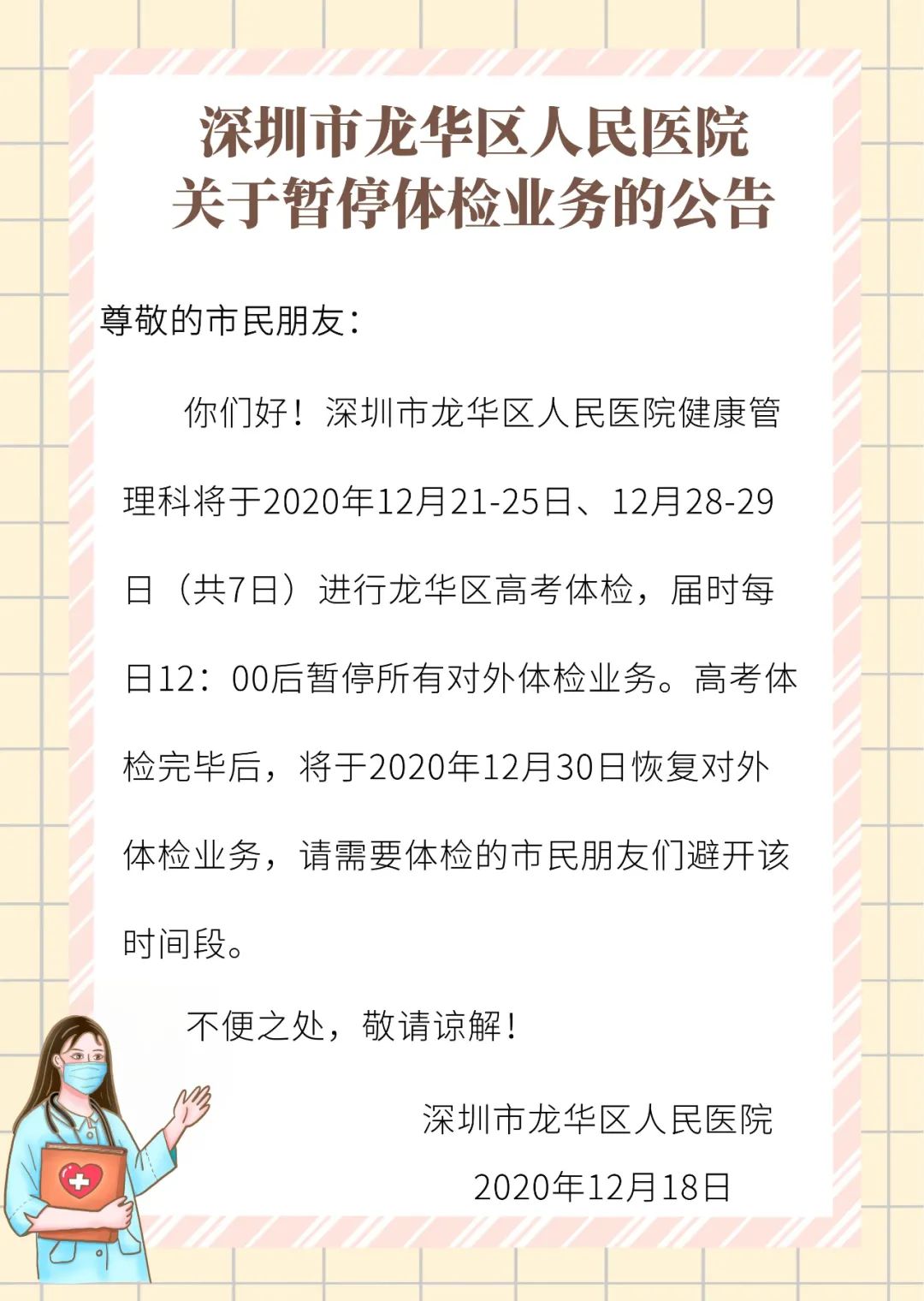 2020年12月深圳龙华区人民医院体检业务暂停详情