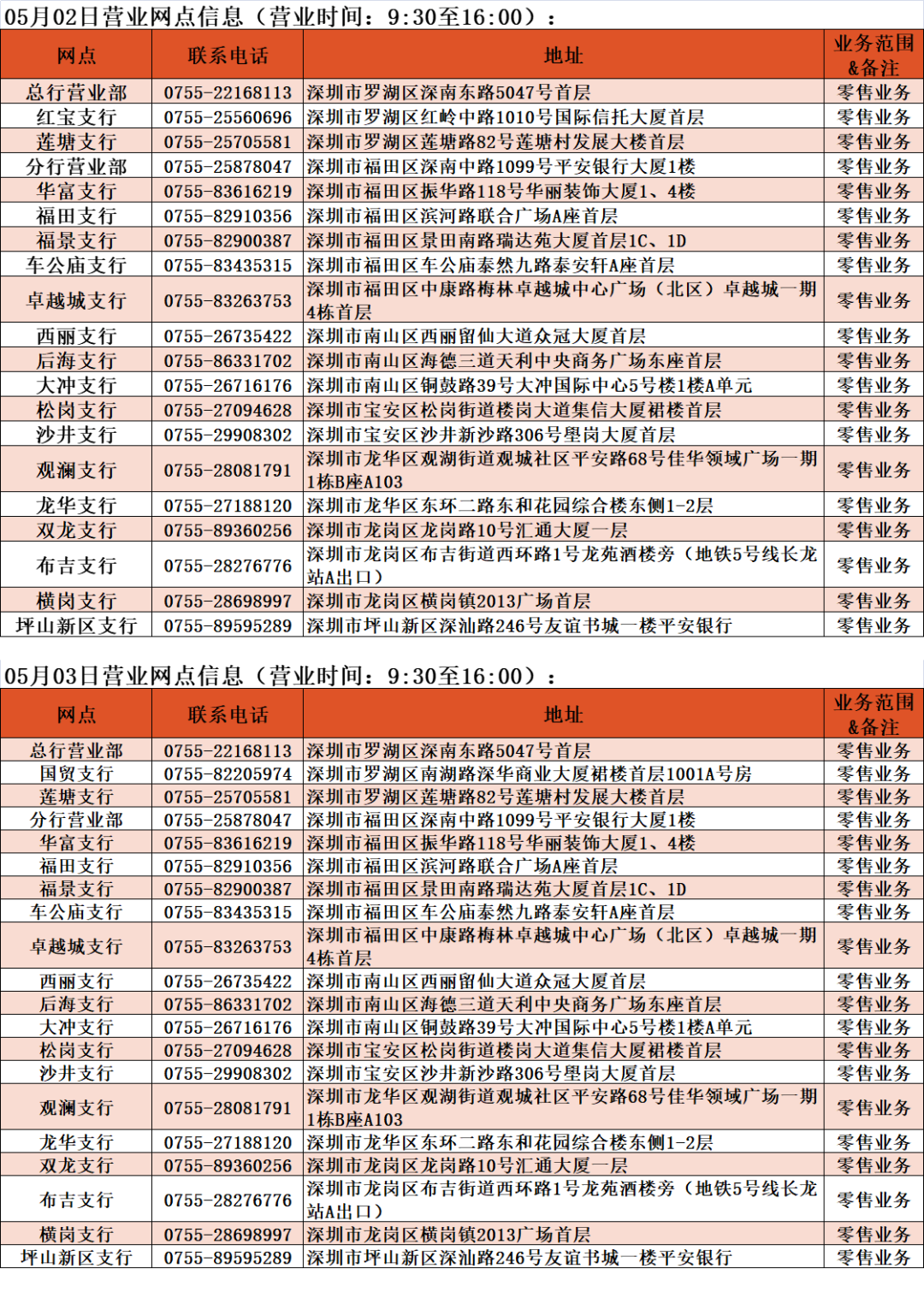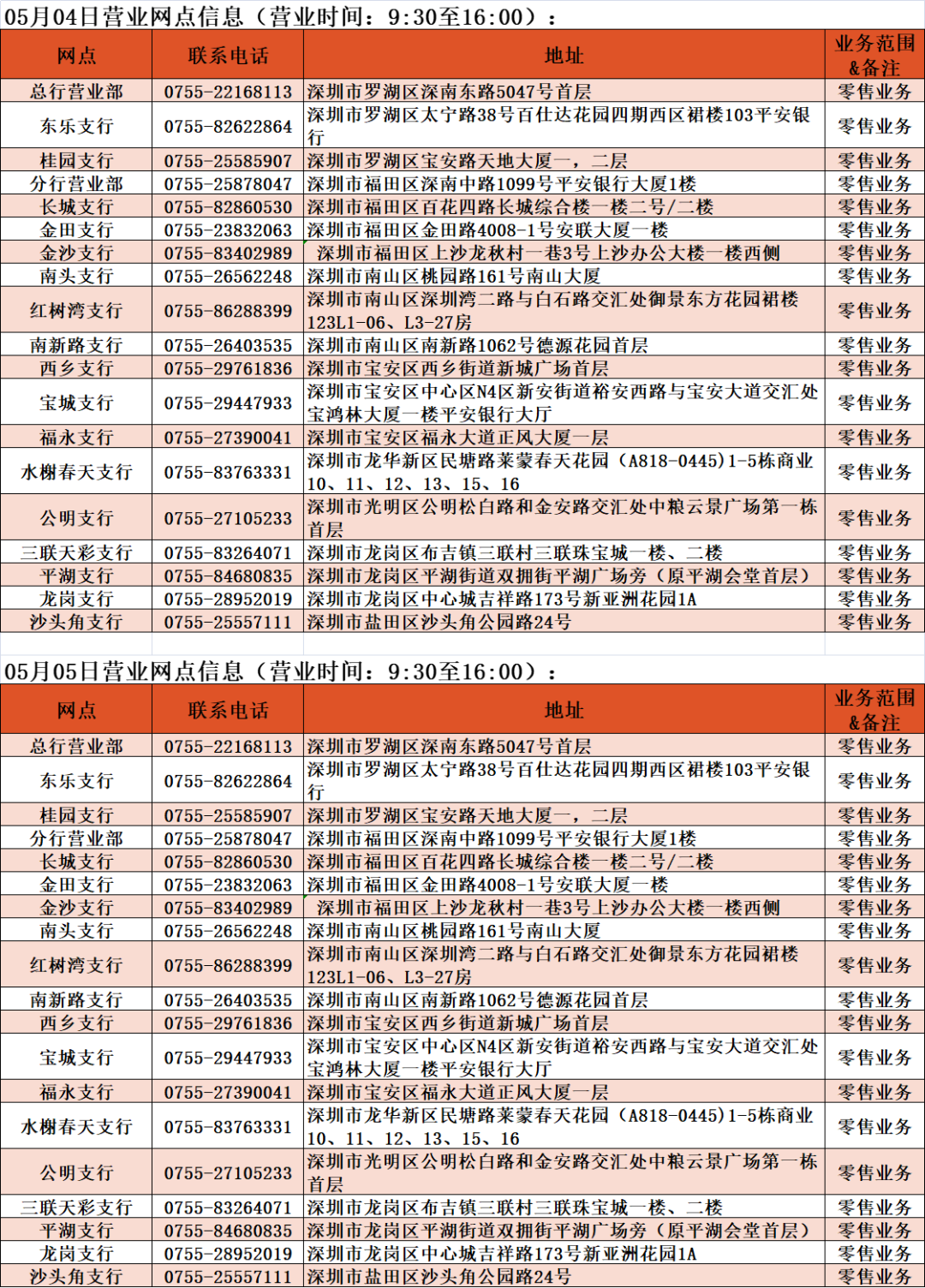 在此期间,自助设备、电话银行、网上银行将正常为您提供服 务。 各网点及社区支行营业时间请查看下表。 由此给您带来不便,敬请谅解。如需帮 ,欢迎垂询平安银行深圳分行客服热线95511-3。 特此公告。