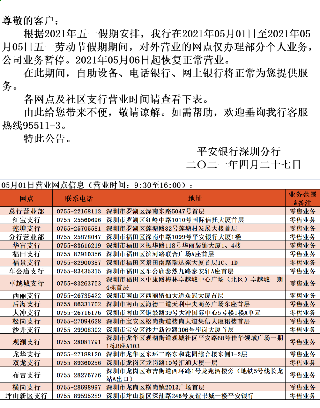 根据2021年五一假期安排,平安银行深圳分行在2021年05月01日至2021年05 月05日五一劳动节假期期间,对外营业的网点仅办理部分个人业务, 公司业务暂停。