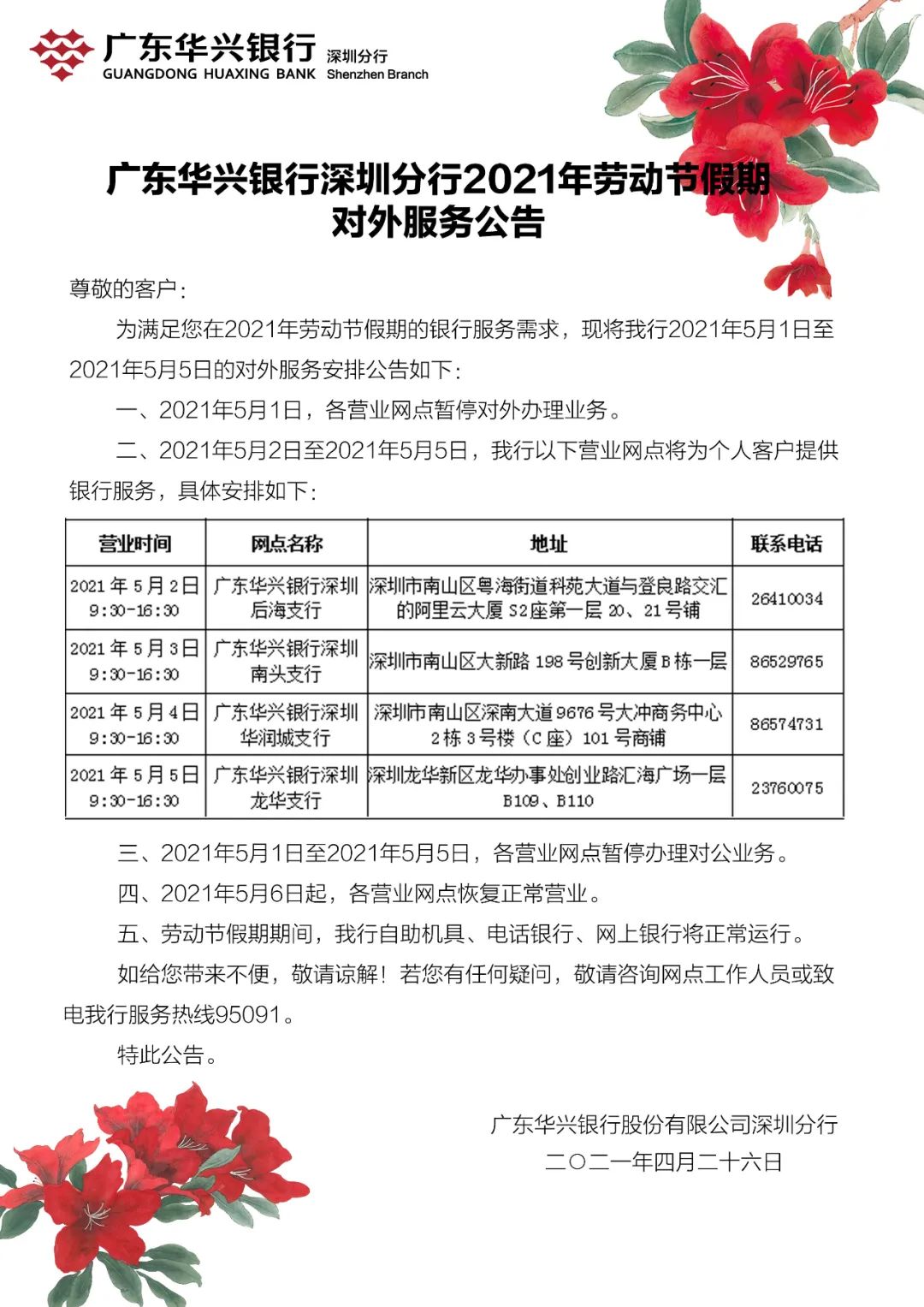 广东华兴银行深圳分行2021年劳动节假期对外服务公告