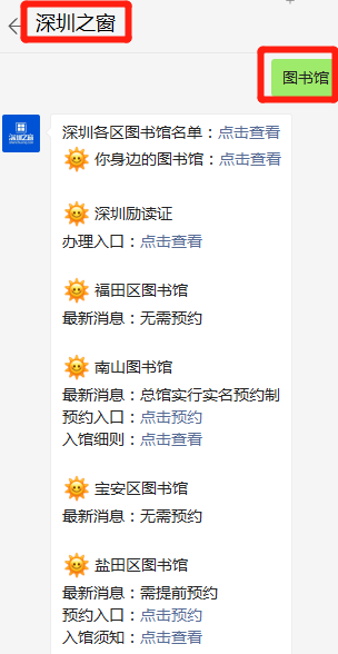 微信搜索或扫描文末二维码,关注【深圳之窗】公众号,对话框发送关键词【图书馆】,即可获取深圳各大图书馆最新开放情况及入馆须知等相关信息;发送关键词【国庆】可获取2021深圳国庆节假期民生信息/交通指引及景区预约入口,活动游玩攻略;发送关键词【核酸】即可获取深圳各大医院机构、社康核酸检测预约入口。